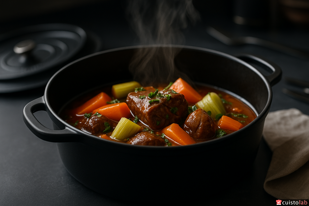 Ce plat ne demande aucune compétence particulière, juste un peu de patience. La viande dore, les carottes fondent doucement, le bouillon se parfume… et tout le monde se régale.